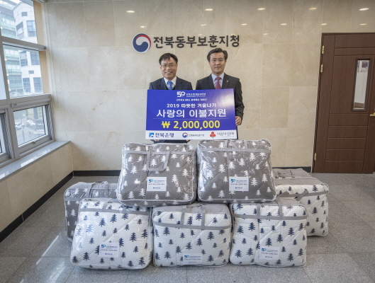 전북은행은 전북동부보훈지청으로부터 도움의 손길이 필요한 국가유공자 독거노인 및 저소득 가정을 추천받아 200만 원 상당의 겨울이불 50채를 지원했다.