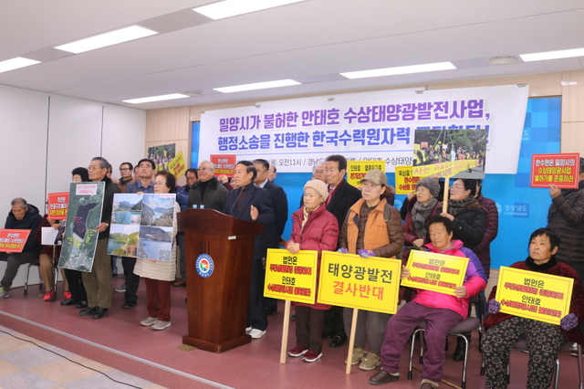 12일 오전 경남도청 프레스센터에서 이곳 주민들이 기자회견을 열고 "안태호 수상태양광발전시설 설치는 절대로 안된다"고 핏대를 세웠다.