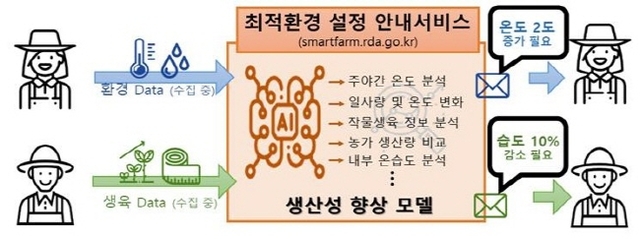 안내서비스는 스마트팜 농가에서 수집되는 온실환경 데이터와 작물생육 데이터를 농진청에서 개발한 생산성 향상 모델(AI)이 분석해 재배시기와 생육상태에 맞는 스마트팜 환경설정값을 제시한다.