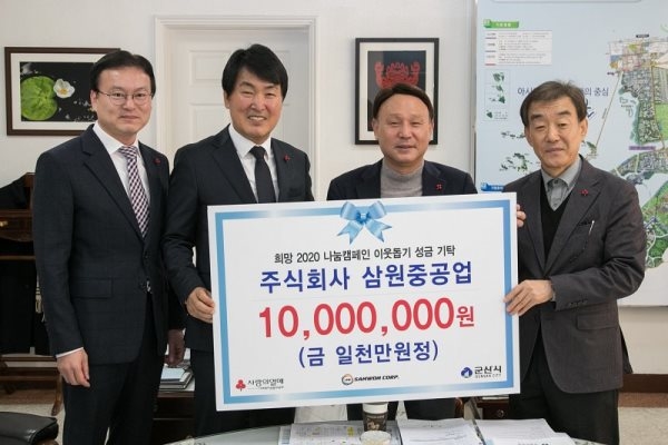 또 중소선박제조 및 특수선건조 전문기업인 ㈜삼원중공업도 조선업 경기 불황에도 불구하고 성금 1000만 원을 기탁했다.