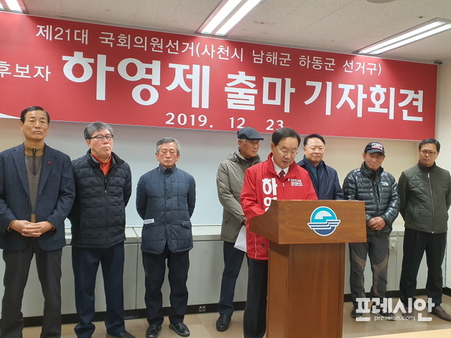하영제 前 농림수산식품부 제2차관이 23일 경남 사천시청 브리핑룸에서 기자회견을 열고 “제21대 총선에서 사천·남해·하동지역구에 자유한국당 소속으로 출마하겠다”고 밝혔다.