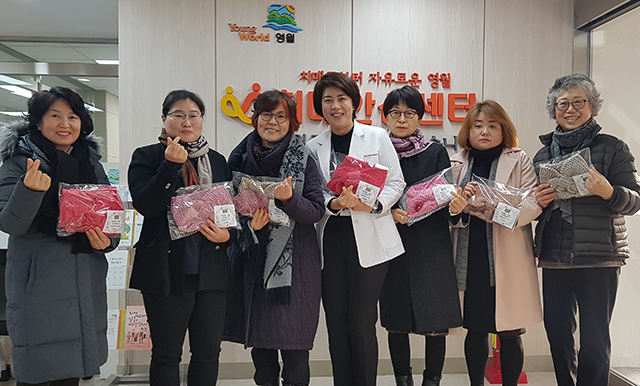 영월군 평생학습센터 매니저 9명은 24일 치매안심센터를 찾아 직접 손으로 뜬 사랑의 목도리 50개를 전달했다.