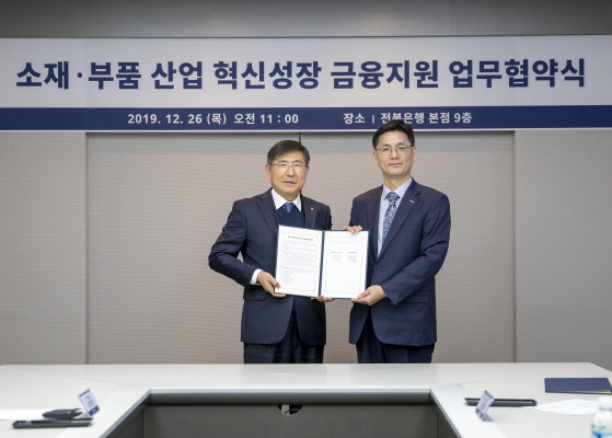 JB전북은행과 기술보증기금(이하 '기보')이 26일 전북은행 본점에서 '소재·부품산업 혁신성장 금융지원 업무협약'을 체결했다.