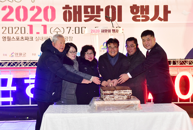 ▲1일 경자년 새해 첫날을 맞아 강원 영월스포츠파크 실내체육관 광장에서 열린 해맞이 행사에서 최명서 영월군수와 참석자들이 2020년 해맞이 행사 축하 떡을 절단하고 있다. ⓒ영월군
