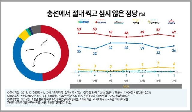 3일 여론조사기관 리서치뷰가 <미디어오늘> 의뢰로 지난달 28일부터 1일까지 전국 성인 1000명을 대상으로 '더불어민주당·자유한국당·바른미래당·정의당·민주평화당·우리공화당 등 6개 정당 중 4.15 총선에서 절대 찍고 싶지 않은 정당'을 물은 결과, 응답자의 49%가 한국당을 선택했다. 한국당 다음으로는 민주당(35%)과 정의당(6%) 순으로 조사됐다.