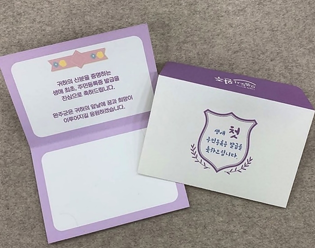 축하카드에는 "귀하의 신분을 증명하는 생애 최초, 주민등록증 발급을 축하드립니다. 완주군은 귀하의 앞날에 꿈과 희망이 이루어지길 응원하겠습니다" 문구가 적혀있다.