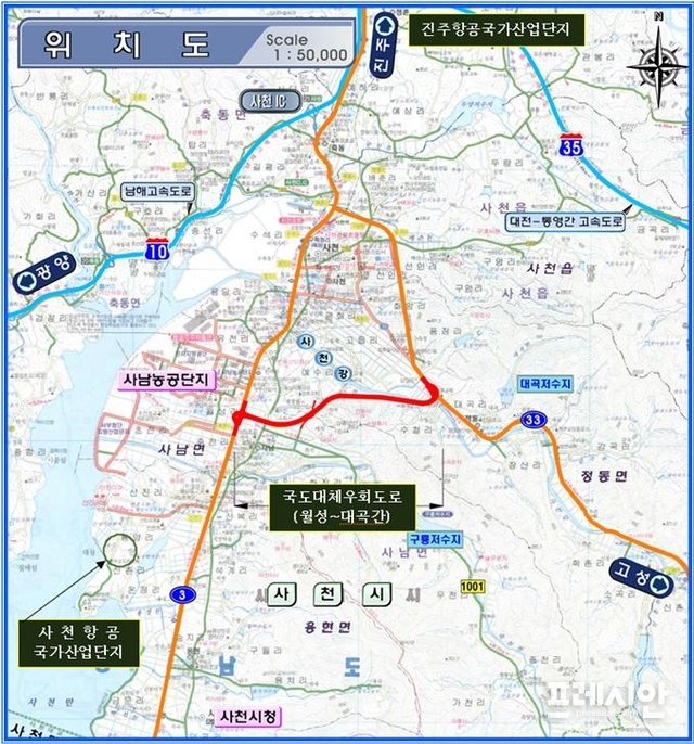 ‘사천 사남~정동간 국도대체우회도로’사업은 국도3호선과 국도33호선을 연결하는 총연장 3.9킬로미터, 폭 20미터의 도로를 개설하는 사업으로 국비 1163억 원이 투입되는 사업이다.