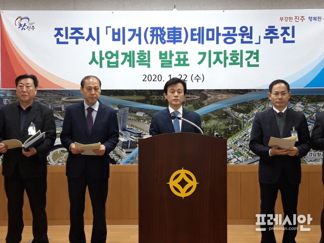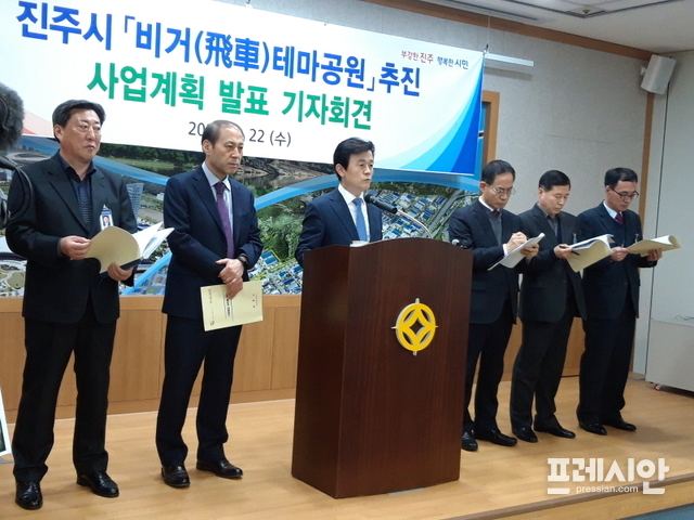 22일 조규일 진주시장이 진주시청 브리핑룸에서 자신의 공약사업인 ‘원더풀 남강프로젝트’사업의 하나로 추진 중인‘비거(飛車) 테마 공원 조성사업’계획안을 발표했다.