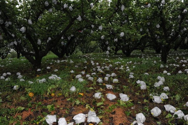 ▲강한 비바람에 낙과한 배들이 과수에서 뒹굴고 있다. ⓒ경상남도