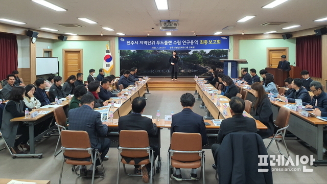 경남 진주시는 29일 농업인회관 3층 교육장에서 시의원, 진주교육지원청, 농협 관계자, 푸드플랜 추진위원뿐만 아니라 생산자, 소비자 등 50여 명이 참석한 가운데 푸드플랜 수립 연구용역 최종보고회를 개최했다.