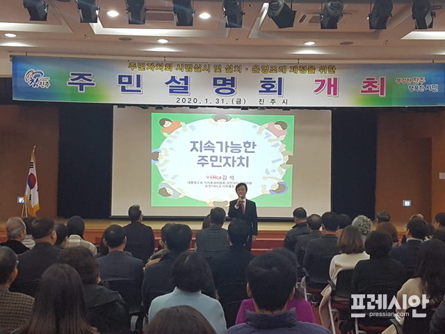 이날 설명회는 주민자치회의 이해와 필요성 및 역할과 기능 등에 대한 주민설명회를 실시하고 진주시 실정에 맞는 주민자치회 제도화를 위한 의견을 수렴하는 시간을 가졌다.