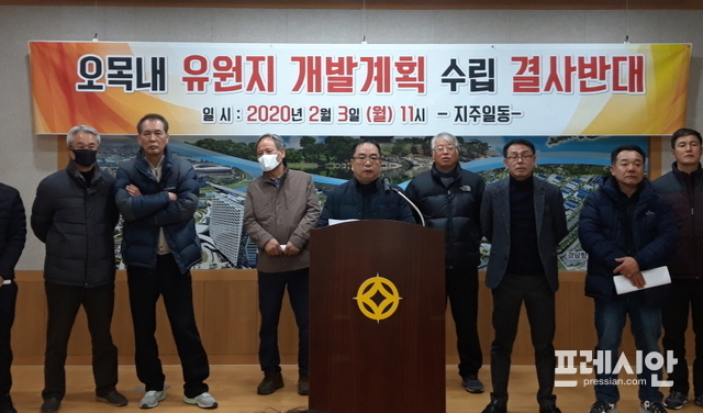 경남 진주시 오목내 주민들이 3일 진주시청 브리핑룸에서 기자회견을 열고 “오목내 유원지 개발계획에 따른 진주시의 비합리 비상식적인 행정절차에 대해 고발 한다”고 밝혔다.