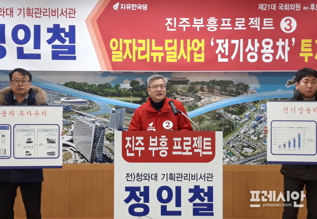정인철 후보는 첫 번째 ‘진주형 일자리 뉴딜사업’으로 초기 임금 3000만 원~4000만 원 수준에 맞는 미래형 전기자동차 사업을 추진하겠다고 말했다.