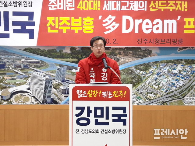 진주을 자유한국당 강민국(49) 국회의원 예비후보는 11일 ‘진주부흥 多Dream 프로젝트’제2탄을 발표하고 ‘春來不似春 '봄은 왔지만, 봄 같지가 않다’라는 말을 인용 “몸도 마음도 많이 얼어붙어 있는 현실에서 젊은 심장의 새로운 엔진으로 진주와 대한민국을 다시 뛰게 하고 싶다”며 복지, 문화, 관광분야의 세부공약을 발표했다.