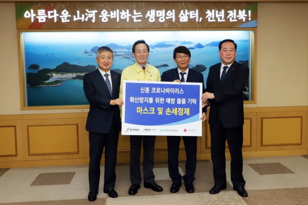 LX는 국민연금과 함께 13일 전북도청 4층 접견실에서 코로나19 확산을 막기 위한 1000만 원 상당의 마스크와 손세정제 구입해 전북 사회복지공동보금회 측에 전달했다.