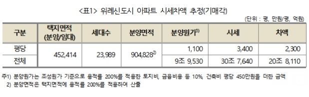경실련에 따르면, 지난달 현재 위례신도시 아파트 평균 시세는 3.3㎡당 3400만 원이다. 여태 공급한 아파트용지 45만 평(용적률 적용 시 90만 평) 전체에 적용할 경우, 현 위례신도시 아파트 시세 총합은 30조8000억 원이다.