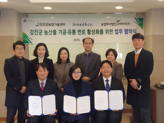강진군이 지난 14일 브레댄코 본사에서 신라명과 베이커리카페 프렌차이즈 브레댄코 및 영농조합법인 고마미지(주)와 함께 강진군 농산물 가공, 유통, 판매 활성화를 위한 업무협약(MOU)을 체결했다.