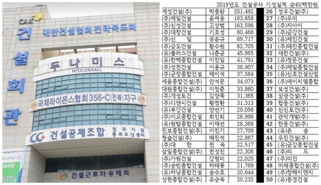 지난 해 도내 실적 1위는 (주)계성건설이 공공주택 건설 등 민간 건설 수주에 힘입어 2년 연속 1위 자리를 지켰고, 꾸준히 아파트를 건설해 온 (주)제일건설이 2위를, 타 지역 민간 공사 수주로 선전한 ㈜신성건설이 3위를 각각 차지했다.