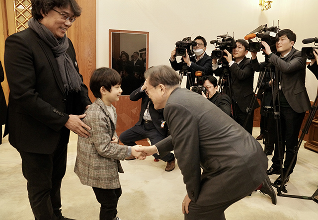 문 대통령은 "아마 축하행사에서 수도 없이 들었을 텐데 대통령의 축하 인사도 특별하지 않다"며, "우리 영화 <기생충>이 세계 최고 영화제라는 아카데미 영화제에서 최고 영예를 얻고, 그리고 또 그 영예의 주인공이 되신 봉준호 감독과 송강호 배우를 비롯한 출연진 스텝, 제작사 모두의 성취에 정말 진심으로 축하 말씀을 드린다"고 했다.