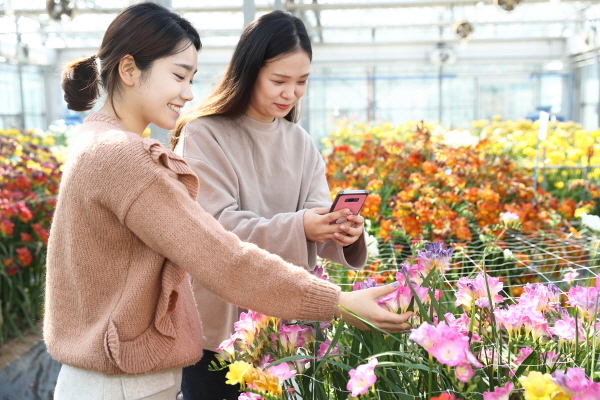 20일 전북 완주군 농촌진흥청 국립원예특작과학원 화훼 온실에서 연구원들이 다양한 색상의 국산 프리지아를 감상하고 있다. 프리지아는 대표적인 졸업식과 입학식 꽃으로 최근 각종 행사 취소로 소비가 위축됐지만, 농촌진흥청은 소비 촉진을 위해 진한 핑크나 보라색 등 국산 품종 보급에 나서고 있다. ⓒ농촌진흥청