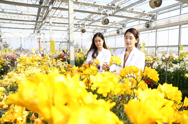 20일 전북 완주군 농촌진흥청 국립원예특작과학원 화훼 온실에서 연구원들이 국산 프리지아 신품종 개발을 위한 꽃 인공수분 작업을 하고 있다. ⓒ농촌진흥청
