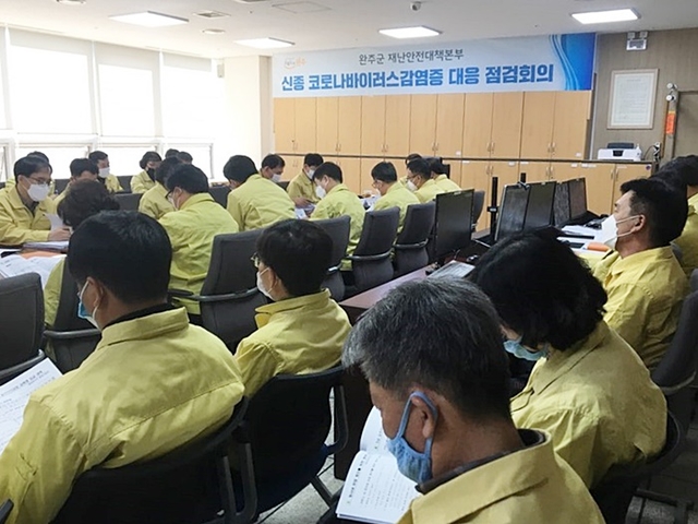 박성일 완주군수는 23일실과 부서장과 읍·면·장 등 70여 명이 참석한 가운데 '코로나19' 대응 제4차 점검회의를 개최하고 청사 내 유입 방지를 위한 방역 강화를 비롯해 중국 유학생 문제와 취약계층 관리 대책 등 10개 분야 대응 상황을 긴밀히 점검한 뒤 철저한 대책 마련을 강조했다.