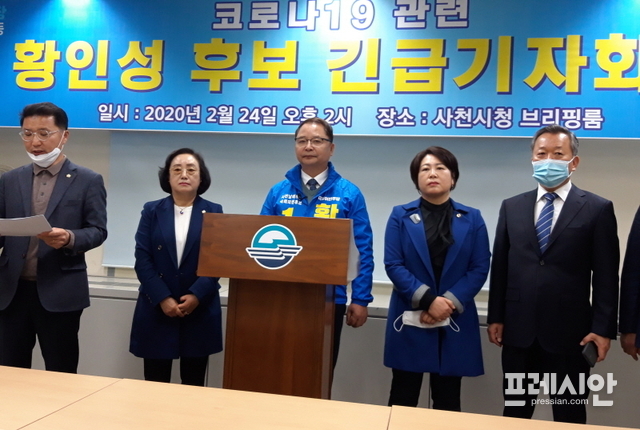 제21대 국회의원선거 더불어민주당 황인성 후보는 24일 사천시청 브리핑룸에서 코로나19 관련 긴급기자회견을 열고 세 가지 입장을 밝혔다.
