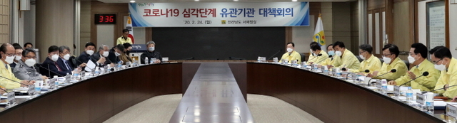 김영록 전라남도지사는 정부의 코로나19 위기 경보가 최고단계인 ‘심각’으로 격상됨에 따라 24일 도청에서 ‘코로나19 심각단계 유관기관 대책회의’를 가졌다.