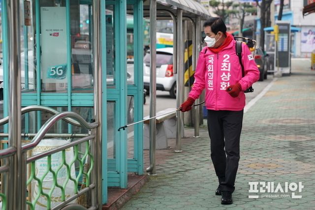 최상화 예비후보(사천, 남해, 하동)는 코로나19가 전국적으로 확산되고 있는 가운데 28알 부터 선거운동을 최소화하는 대신 소독장비를 직접 메고 지역구 관내와 취약계층 이동지역을 중심으로 방역작업에 나섰다.