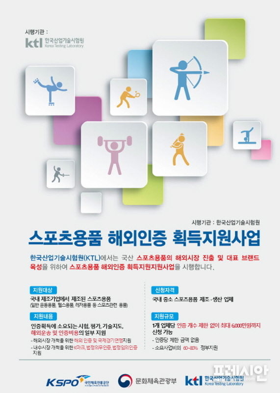 한국산업기술시험원(KTL)은 국민체육진흥공단이 관리하는 ‘2020년 스포츠용품 해외인증 획득지원사업’참여기업 접수를 오는 20일까지 받는다.