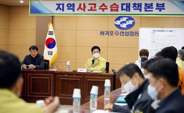 원희룡 지사는 4일 새벽 우도 남동쪽 74km 해상에서 화재 사고로 침몰한 서귀포선적 29톤급 제307호 해양호 수습대책본부가 차려진 서귀포수협을 방문한 자리에서 사고수습에 최선을 다해 달라고 말했다.