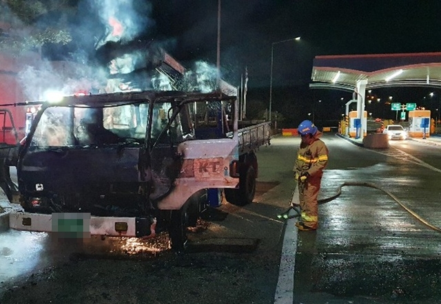 고속도로 톨케이트를 통과하던 크레인 차량에서 불이나 30여분 만에 진화됐다.