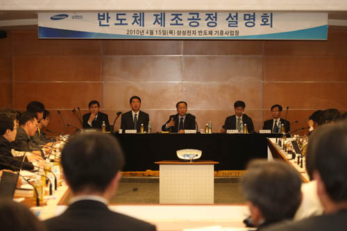 | ▲ 삼성이 15일 반도체 공정라인 공개에 앞서 진행한 간담회에서 조수인 삼성전자 반도체사업부 사장이 기자들의 질문에 답하고 있다. ⓒ삼성전자 |