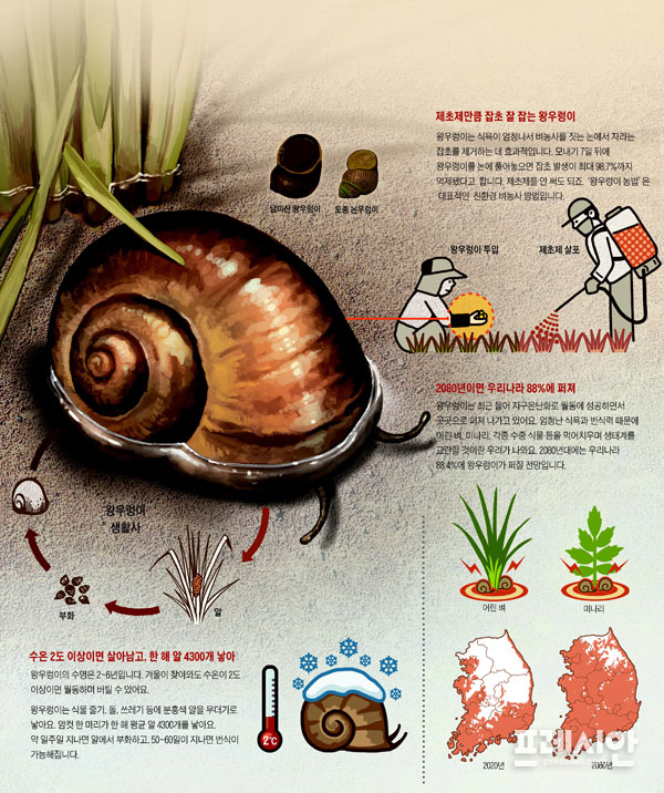 13일 시에 따르면 왕우렁이는 1992년부터 논 잡초제거용으로 활용되기 시작하고 친환경 및 관행 벼 재배농가에서 비용이 적게 들고 제초효과가 탁월해 친환경농업에 널리 이용되고 있다.