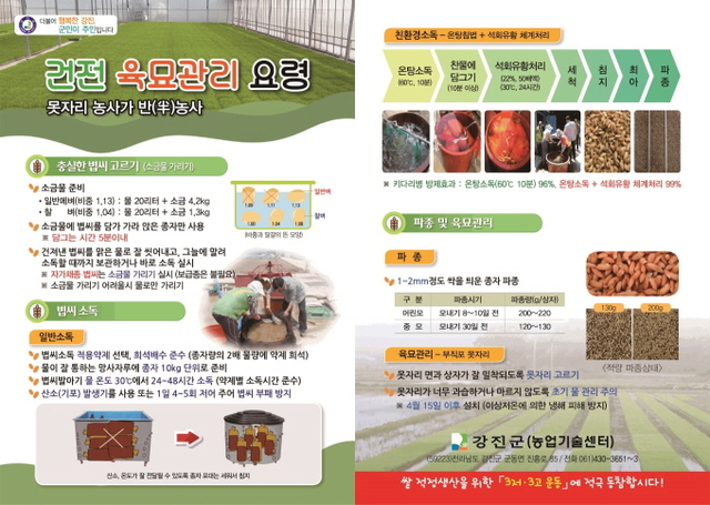 건전육묘 관리 요령으로는 충실한 볍씨 고르기, 관행재배 시 볍씨소독 적용약제 선택, 희석배수 준수한 후 30℃에서 24~48시간 침지 소독하는 것이다. 친환경 재배 시 벼 온탕침법은 볍씨를 60℃ 물에 10분간 담그고 찬물에 10분 이상 식히고 2차로 30℃ 물에서 친환경 자재를 사용해 24시간 종자소독을 하고 건진 후 세척, 침종, 최아, 파종하면 95% 이상의 방제 효과를 볼 수 있다는 내용도 담겨있다.