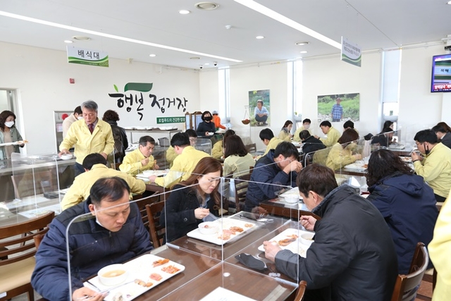 전북 완주군이 '코로나19' 확산 방지를 위해 16일 구내식당에 투명 칸막이를 설치해 비대면 식사에 나섰다.