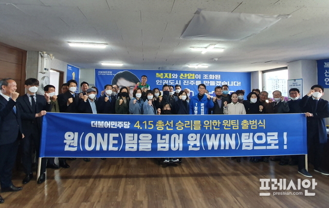 더불어민주당 진주시갑 국회의원 후보 경선에 참여했던 정영훈·갈상돈·김헌규 예비후보는 17일 정영훈 국회의원 후보 선거사무소에서 원팀 출범식을 가지고 총선 승리 의지를 다졌다.