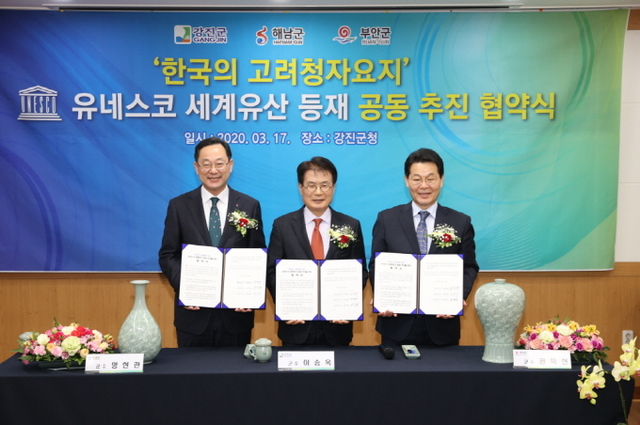 전남 해남군(군수 명현관)은 고려시대 주요 청자생산 지역인 강진군, 부안군과 고려청자요지의 세계유산 등재를 공동으로 추진하기로 하고, 지난 17일 강진군청에서 업무협약(MOU)을 체결했다.