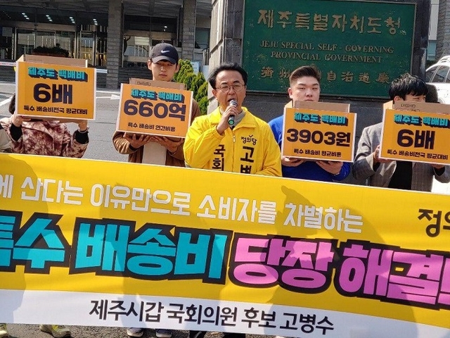 제21대 국회의원 선거에 출마한 제주시갑 선거구 정의당 고병수 예비후보가 제주지역 특수배송비에 대한 시스템 개선을 약속했다.