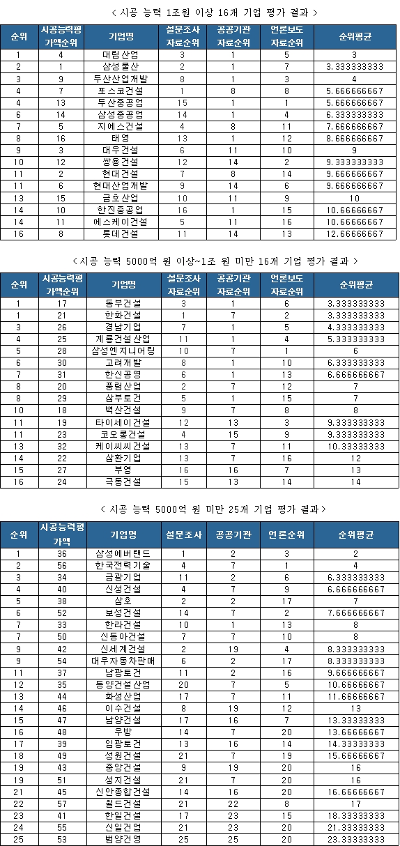 시공 능력 5000억~1조 원의 16개 기업을 대상으로 한 평가에서는 동부건설, 한화건설이 각각 1, 2위를, 극동건설이 최하위인 16위를 차지했다. 시공 능력 5000억 원 미만의 25개 기업을 대상으로 한 평가에서는 삼성에버랜드, 한국전력기술이 1, 2위를, 범양건영이 최하위인 25위를 차지했다.