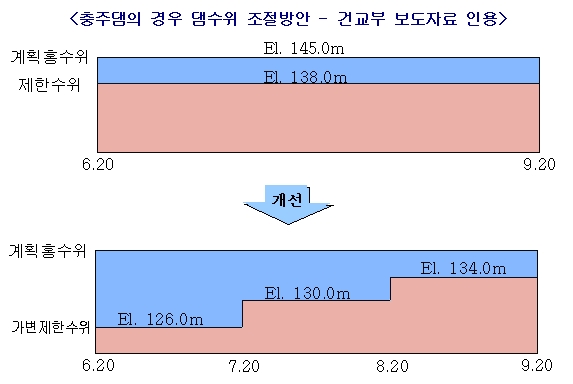 건교부는 충주 댐의 경우 기존에는 6월 20일부터 9월 20일까지 제한수위 138m를 유지하는 것이 원칙이었지만 2006년 이후에는 6월 20일부터 7월 20일까지 제한수위 126m를 유지해서 충분한 저수량을 확보하겠다는 것이다. 그러나 환경연합 조사결과 건교부는 이번 집중호우에 앞서 충주댐의 저수량을 사전에 조절하지 않았음이 밝혀졌다.