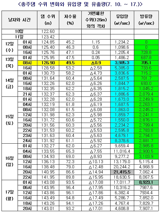 만일 건교부가 집중호우를 대비할 자세가 있었다면 7월 13일 08시 이후부터 충주댐의 가변제한수위를 126m로 유지하기 위해 유입되는 양만큼 방류해서 가변제한수위를 유지했어야 했다. 집중호우가 본격적으로 시작된 15일 자정까지 64시간의 여유가 있었기 때문에 건교부는 충분한 여유가 있었던 것이다. 그러나 건교부는 집중호우로 댐의 유입량이 급격하게 늘어나기 시작한 15일 24시가 지난 다음에도 무려 20시간 후인 16일 20시가 돼서야 비로소 방류량을 7000t 이상으로 늘리게 된다. 그러나 공교롭게도 16일 20시는 댐의 유입량이 초당 2만1415t을 기록하여 최대치를 기록한 시간이었다.