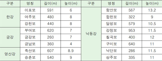 | ▲ 4대강에 들어서는 보의 높이과 길이. ⓒ프레시안 |