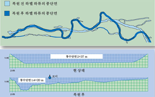 그러나 복원에 대한 '해석'은 4대강 사업에 반대하는 환경단체나 하천전문가들과는 정반대다. 정부는 준설과 보 설치를 골자로 하는 4대강 사업으로 강의 '물 그릇'을 확보해, 홍수 방지와 수자원 확보를 동시에 이룰 수 있다고 주장한다. 강을 따라 제방을 높이 쌓는 낡은 방식을 벗어나, 준설로 강바닥을 깊게 파 홍수에 대비하는 '신개념 홍수 방어'를 하겠다는 것이다.