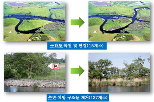 라인강·엘베강의 사례만 봐도, 제방을 바깥쪽으로 후퇴하고 습지와 홍수터를 복원해 강의 유속을 줄이는 '분산적인 홍수 방어'가 홍수 대책의 골자를 이뤘다. 반면, 한국습지NGO네트워크에 따르면 4대강 사업으로 훼손되는 우리나라의 습지는 애초 정부 발표의 2배인 98곳이며, 이중 45곳은 영구 침수될 위기인 것으로 밝혀졌다. (☞관련 기사:"4대강 사업으로 파괴되는 습지, 정부 발표의 2배")