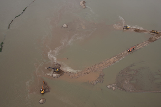 | ▲ 하늘에서 내려다 본 낙동강 준설 현장의 모습. 준설로 인한 뿌연 탁수가 가득하다. ⓒ낙동강지키기부산시민운동본부 |
