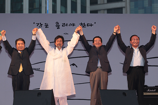| ▲ 야4당 대표들이 4대강 사업 중단을 요구하며 손을 들어보이고 있다. (왼쪽부터) 이재정 국민참여당 대표, 강기갑 민주노동당 대표, 정세균 민주당 대표, 노회찬 진보신당 대표. ⓒ프레시안(최형락) |
