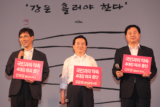 지난 1일 취임한 김두관 경남도지사는 "세종시 원안을 지켜냈듯이 민주·개혁 진영이 단결해 4대강을 지켜내자"며 "경남도가 앞장서서 낙동강을 지키겠다"고 밝혔고, 안희정 충남지사 역시 "강을 살리는 일은 민주주의를 살리는 일"이라며 4대강 사업 중단의 의지를 내비쳤다.