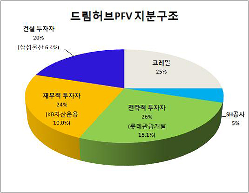 삼성·국민연금 컨소시엄은 사업권을 따낸 후 개발을 위한 프로젝트 금융투자 회사(PFV) 드림허브프로젝트금융투자㈜(이하 드림허브PFV)를 구성했다. 일종의 페이퍼 컴퍼니인 이 회사의 지분은 총 30여개 회사가 갖고 있다. 코레일이 25.0퍼센트의 지분을 가져 최대 주주며, SH공사(서울시)가 코레일이 갖고 있던 지분 4.9퍼센트를 받았다.