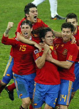 8일 새벽(한국시간) 더반 모세드 마비다 스타디움에서 열린 4강 두 번째 경기에서 국제축구연맹(FIFA) 랭킹 2위 스페인은 후반 28분 터진 푸욜의 헤딩 결승골에 힘입어 독일에 1대 0으로 신승, 사상 첫 월드컵 결승행을 확정했다.